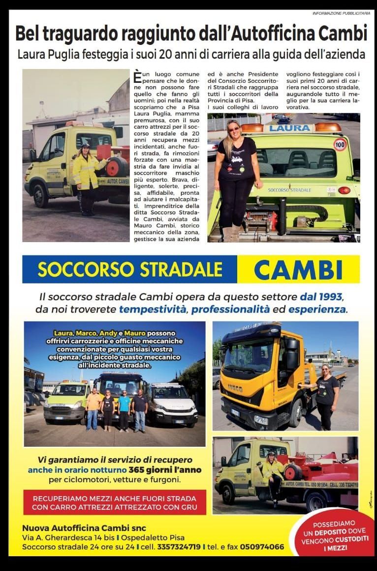 Il Soccorso Stradale Cambi opera in questo settore da più di 30 anni; da noi troverete tempestività, professionalità ed esperienza. Laura e Marco e Andy possono offrirvi carrozzerie, gommisti e officine meccaniche convenzionate per qualsiasi vostra esigenza.